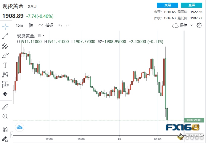 現貨黃金短線上揚逾10美元,至1922.36美元/盎司高點,隨後自高位大幅回落並刷新日低至1907.77美元/盎司